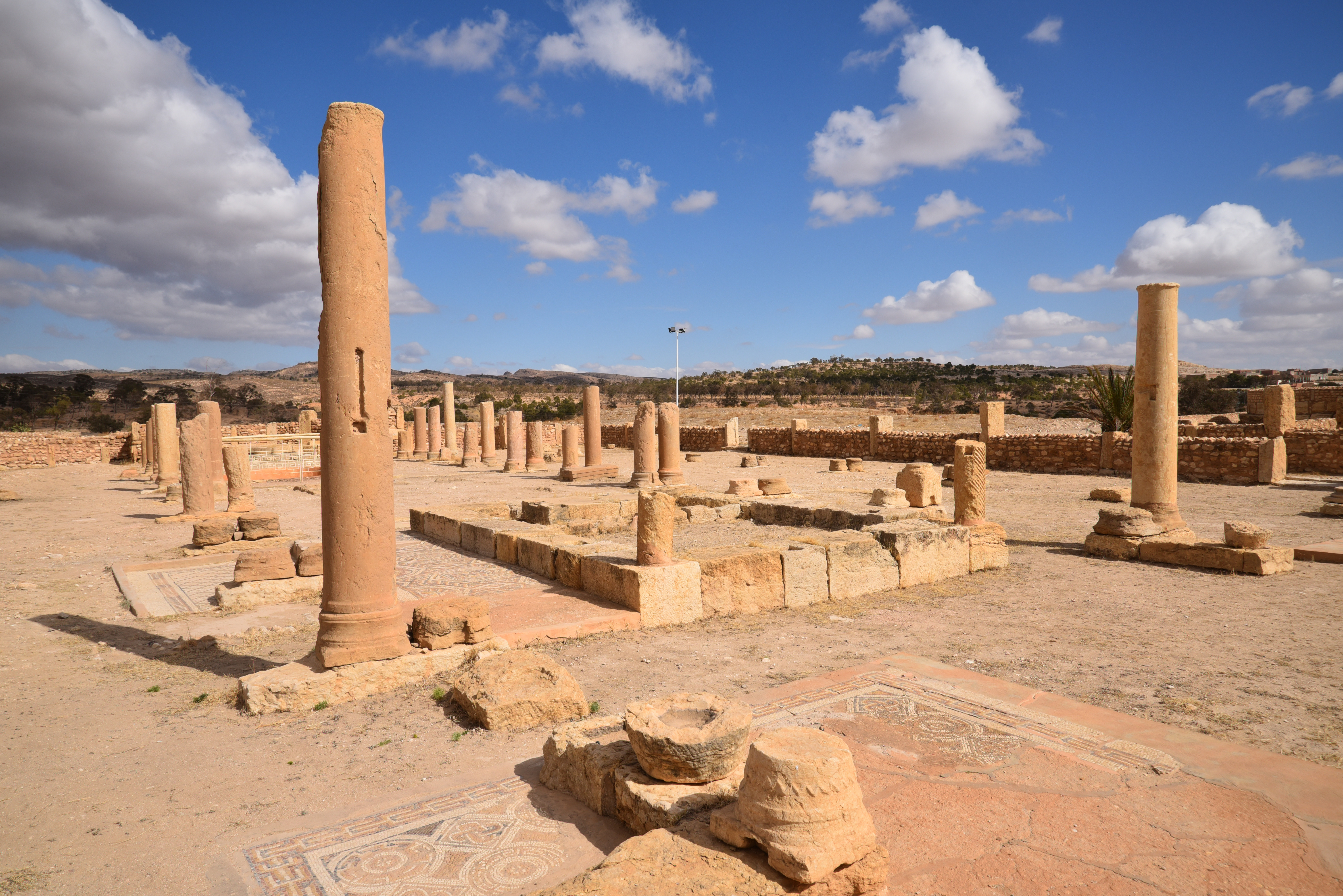 The East Temple and the colossal Memmian Baths.Although they have suffered from earthquake damage over the years, these ruins reveal the sheer scale of the baths, which included changing rooms, a gymnasium, and the frigidarium.Apse in the Memmian Baths decorated with a shell mosaic.Inscription (ILAfr 454) on a statue base praising Julia Memmia “because of the extraordinary magnificence of her work, the baths, by which she beautified her native city and contributed to the health of the citizens”. Dated 3rd century AD.The Memmian Baths were named after Julia Memmia, daughter of local Roman consul Gaius Memmius Fidus Julius Albius, as she paid for their construction. Julia dedicated the baths to the wife of Septimius Severus, the first African Roman emperor who ruled the Roman Empire in AD 193–211.The west-east main artery that connected the Memmian Baths to the theatre.The Augusteum lining the west-east main artery. It was a large, closed building constructed to the glory of Septimius Severus and his sons Caracalla and Geta, with various rooms arranged around a garden.The Augusteum was 85 m long and 65 m wide. It had a semicircular library, exedra square, a cella and baths.The Temple of Isis, built in the 1st century AD and repaired in the second half of the 2nd century AD.The Temple of Isis is rectangular in shape and was built on a podium and bordered to the west by a Numidian wall. A staircase of seven steps gives access to a cella preceded by a pronaos. A row of six columns flanks the temple on the east and west sides.Dedication to Isis (AE 2005,1690) in front of the podium of the Temple of Isis by P. Aelius Privatus and his wife, Cocceia Bassa. Dated AD 131 – 170. Isidi Aug(ustae) sac(rum) / P(ublius) Aelius Priva/tus et Cocceia / Bassa uxor eius / aram ex vot(o) / liben(te)s animo / posuer(unt) et / ded(icaverunt)The Roman Theatre, built during the co-rule of Marcus Aurelius and Lucius Verus (AD 161–169).The theatre stands at the eastern end of the town, close to the forum, and features a 4th-century CE bear mosaic on the pavement of the orchestra.Fourth-century AD bear mosaic on the pavement of the theatre’s orchestra.The main north-south artery connecting the Roman Theatre to the Forum.The Market in the Forum, a rectangular courtyard with paving, surrounded by porticoes and accessed through three doors. There were a total of 12 shops, with six situated in the northern area and six located in the southern area. It was built in the 3rd century AD over earlier remains dated to 150-50 BC.The Basilica in the Forum. The public building featured an apse at both ends and was constructed on a platform accessed by a staircase with four steps.The Temple of Apollo, located within the Forum and to the north of the Capitol, was likely built during the reign of Emperor Tiberius in AD 34-35. Excavations have yielded significant artefacts, including a large statue of Apollo now displayed at the Bardo Museum in Tunis.Measuring 26.5m in length and 24m in width, this building, dedicated to Apollo, the city’s protecting deity, features an African-Roman type plan with an open-air courtyard and worship rooms where the various deities were venerated.The paved street leading to the residential area featuring underground houses designed to provide relief from the intense summer heat.The House of the Hunt, a wealthy Roman residence named after the partial hunting scene mosaic, is one of the most striking. The sixteen columns of reddish stone resting on stone bases were dug from the luxurious marble quarries of Simitthus (modern-day Chemtou).Each room of the House of the Hunt had light entering through a light shaft or the open patio. It also had a separate double toilet and bathroom (unusual at the time) as well as private baths.The underground peristyle of the lower floor of the House of the Hunt featuring Corinthian columns.The House of the New Hunt. It had rooms arranged around a peristyle that rested partly on cisterns. An above-ground hunting mosaic, from which the house derives its name, has been left in situ, depicting the owner and his servants on a hunt.In-situ mosaic from the House of the New Hunt depicting the owner and his servants on a hunt. The scene is surrounded by a beautiful, inhabited scroll frame, which includes animals (hare, wild boar, dog, gazelle).The subterranean five-column hall of the House of the New Hunt has a geometric floor mosaic.The House of the New Hunt.In-situ mosaic in the House of Amphitrite depicting Venus being carried ashore by a pair of Ichthyocentaurs (fish-tailed centaurs) following her birth from the sea foam.Mosaic floor depicting a female character in the corridor of the House of Amphitrite. Dated to the 3rd century AD.The residential area has a complex of five houses with underground features.The House of Fishing with columns dug from the luxurious marble quarries of Simitthus (Chemtou).The house, the earliest of the villas, features a separate double toilet and bathroom, along with private baths. It also includes an underground colonnaded courtyard. A small room contains a fishing-themed mosaic.The subterranean House of Treasure. The house was so named due to the hoard of 7th-century AD Byzantine coins that archaeologists uncovered here in 1942. The large dining room is decorated with a geometrically patterned mosaic; next door is a bedroom.