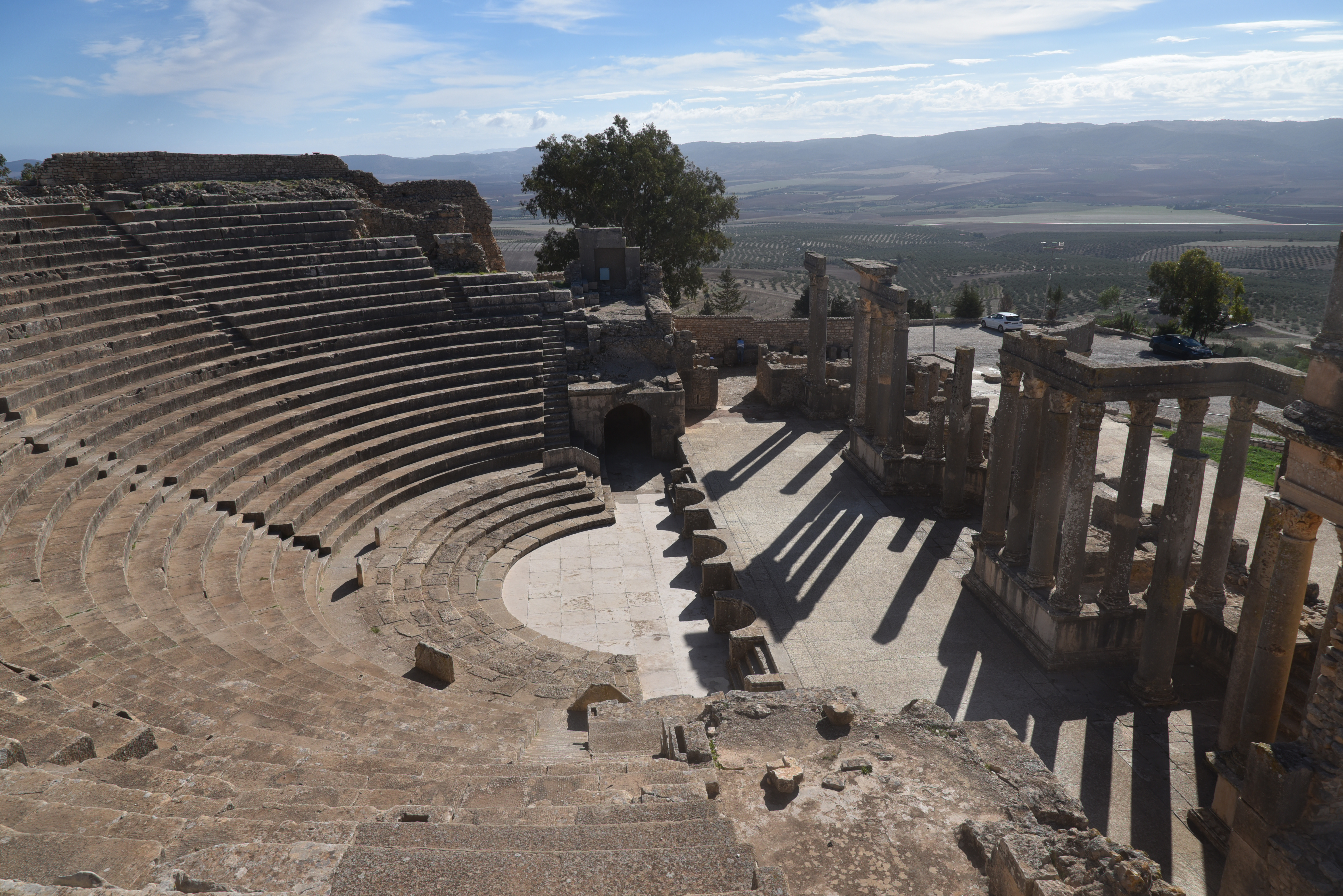 The Theatre of Dougga was completed around the year 166 under Antoninus Pius. It was paid for by Publius Marcius Quadratus, a member of one of the wealthiest families in the city.Quite modest in size, the theatre could seat 3,500 people on its 19 semicircular tiers cut into the hill slope.The theatre stage had a central semi-circular niche with square niches on either side.The seating was divided into different areas by barriers and stairways and could be entered from the top or the sides.The inscription running along the summa cavea of the Theatre of Dougga (Tunisia) is dedicated to the salus of Marcus Aurelius and Lucius Verus and to Publius Marcus Quadratus, priest of the imperial cult, decurion, and the financier of the theatre. CIL 08, 26528