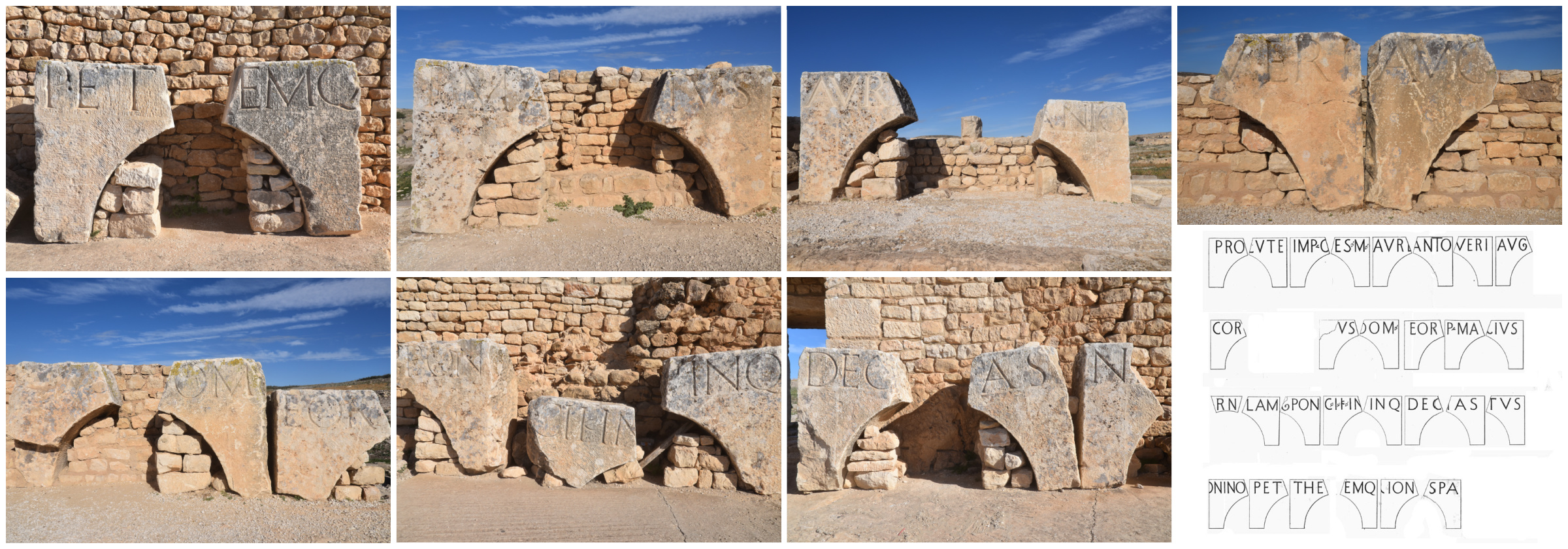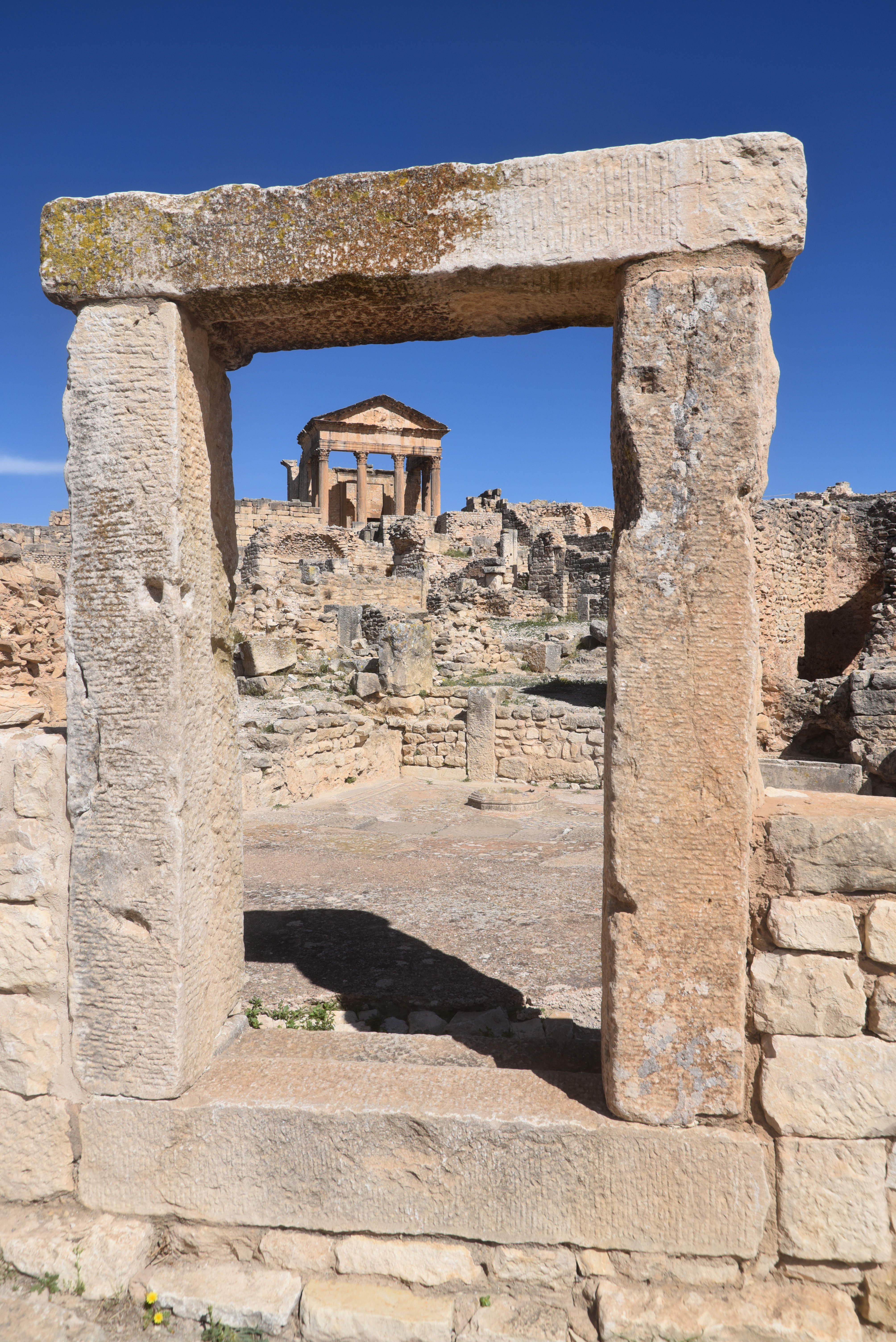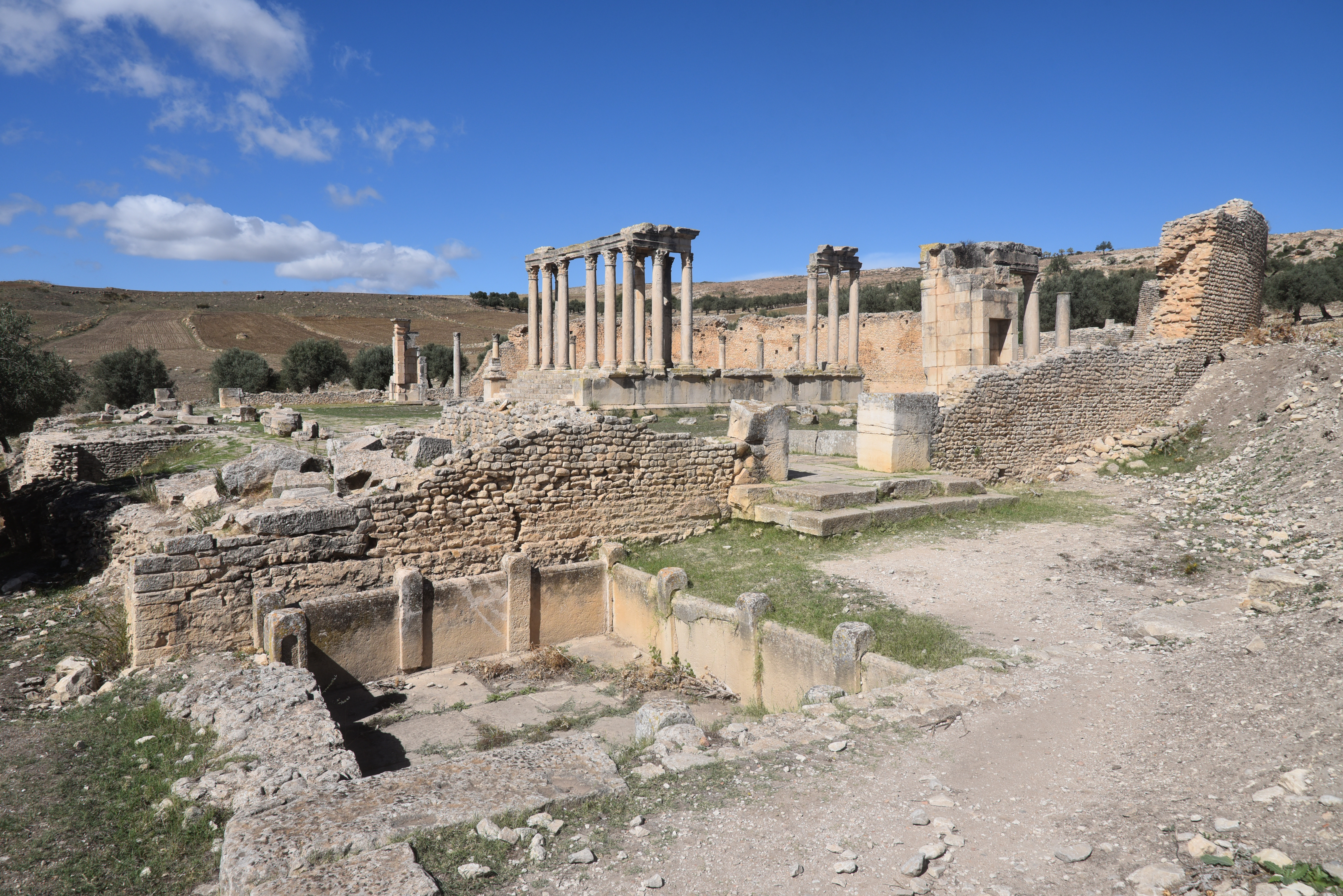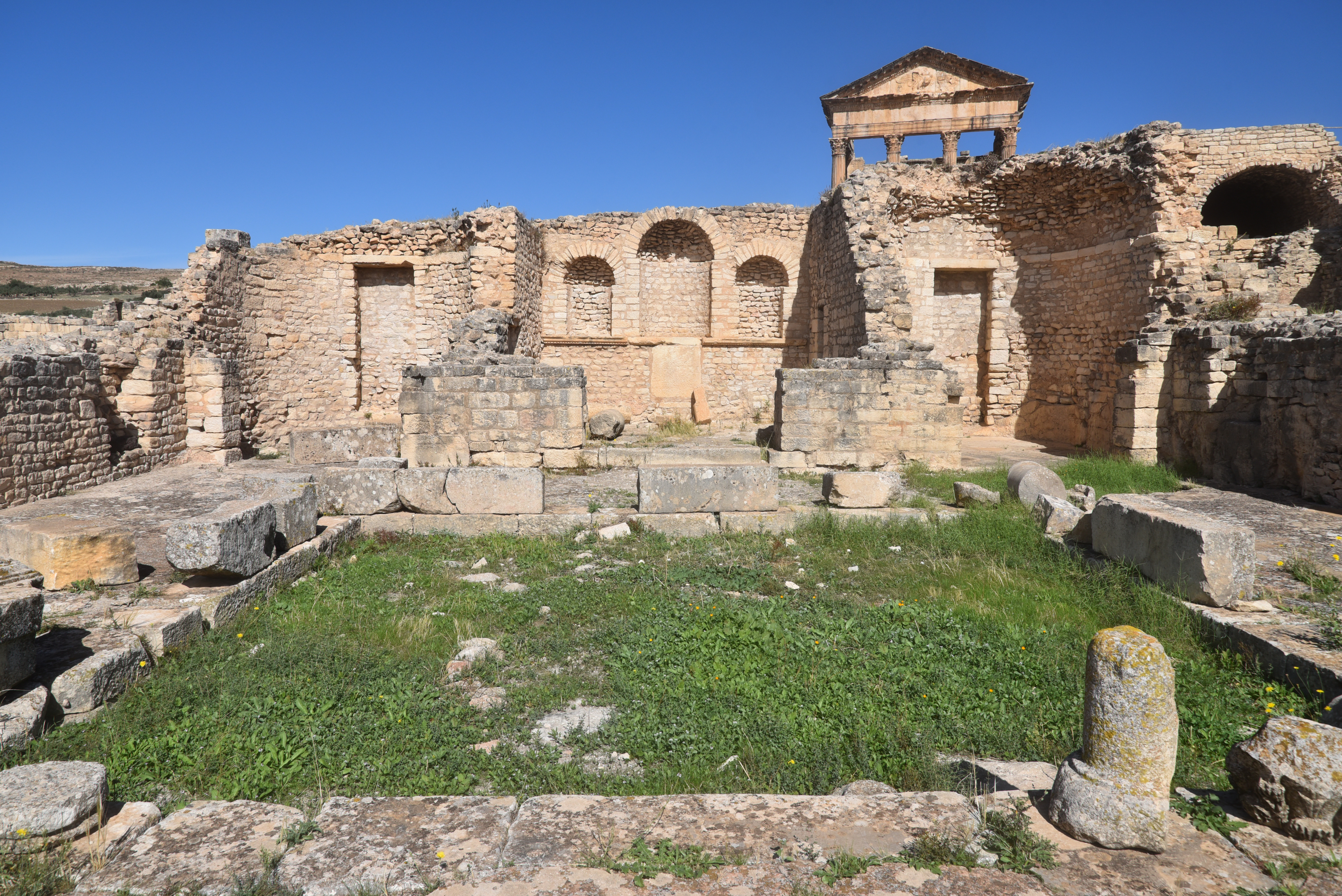 View of the theatre from the front with the inscription that stood across the frieze of the stage building. It commemorates the theatre donation by Publius Marcius Quadratus in AD 168-9. The inscription tells that he built the theatre with curtains and decorations when he became Flamen for life. He paid for these with his own money.View of Dougga from the Theatre.At the heart of Thugga was the Capitol, with the temples of Augustan Piety and Mercury, the Forum and the Macellum (market).The small Temple of August Piety and the Capitol.The small Temple of August Piety was probably built during the reign of Hadrian. It is composed of a semi-circular cella and a tetrastyle Corinthian portico. Seven steps of stairs provided access to the temple.The Square of the Wind Rose and the Capitol.The Square of the Wind Rose was built between AD 180 and 192. The semicircular square was named after a large compass engraving cut into the paving, naming the 12 winds. To the north stands the Temple of Mercury with its rectangular cella flanked by two exedrae.The Capitolium, dedicated to the Capitoline triad, Jupiter, Juno and Minerva, was built of local hard limestone in opus africanum during the joint reign of Marcus Aurelius and Lucius Verus in AD 166-167.The Capitol’s tetrastyle façade is characterised by four fluted columns, 8 m high, on the facade and two on the side.On the architrave of the Capitol, an engraved inscription commemorates the completion of the work and provides the names of the sponsors, Lucius Marcius Simplex and Lucius Marcius Simplex Regillianus. The temple is topped by a triangular pediment with a relief depicting the apotheosis of Antoninus Pius, raised to the skies by an eagle.