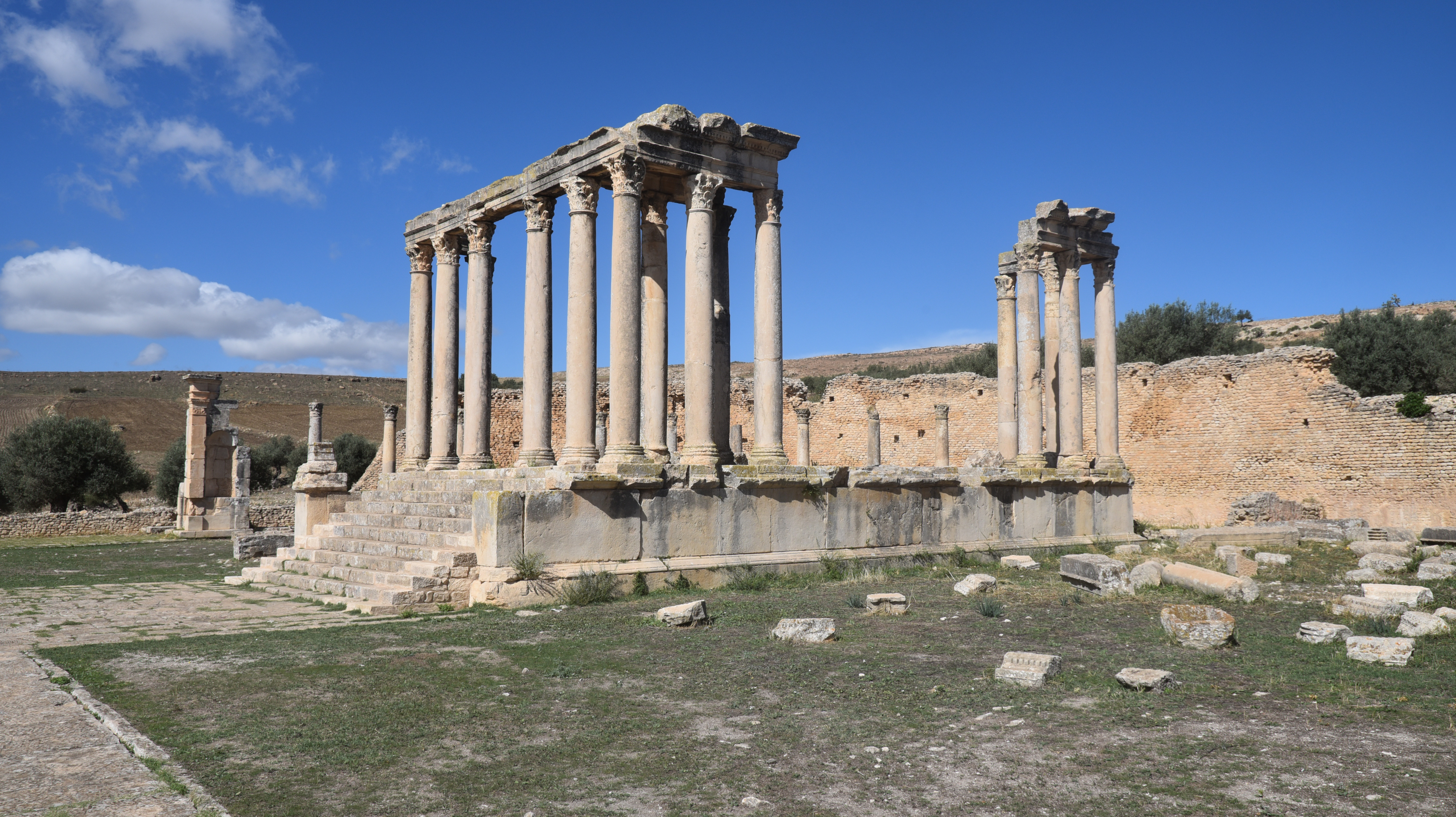 The archaeological site of Dougga (Latin: Thugga), located in northern Tunisia, is one of the best-preserved examples of a Roman town in North Africa. Spanning approximately 70 hectares, this UNESCO World Heritage Site provides a remarkable glimpse into the region’s urban planning, architecture, and daily life of ancient Roman and pre-Roman civilisations. Its hilltop location offers sweeping views and remarkably intact ruins, which make it one of the most significant and visually striking archaeological sites in the Mediterranean region. The site’s most famous monuments include the Libyco-Punic Mausoleum, the Capitolium, the Roman theatre, and the temples of Saturn and Juno Caelestis.