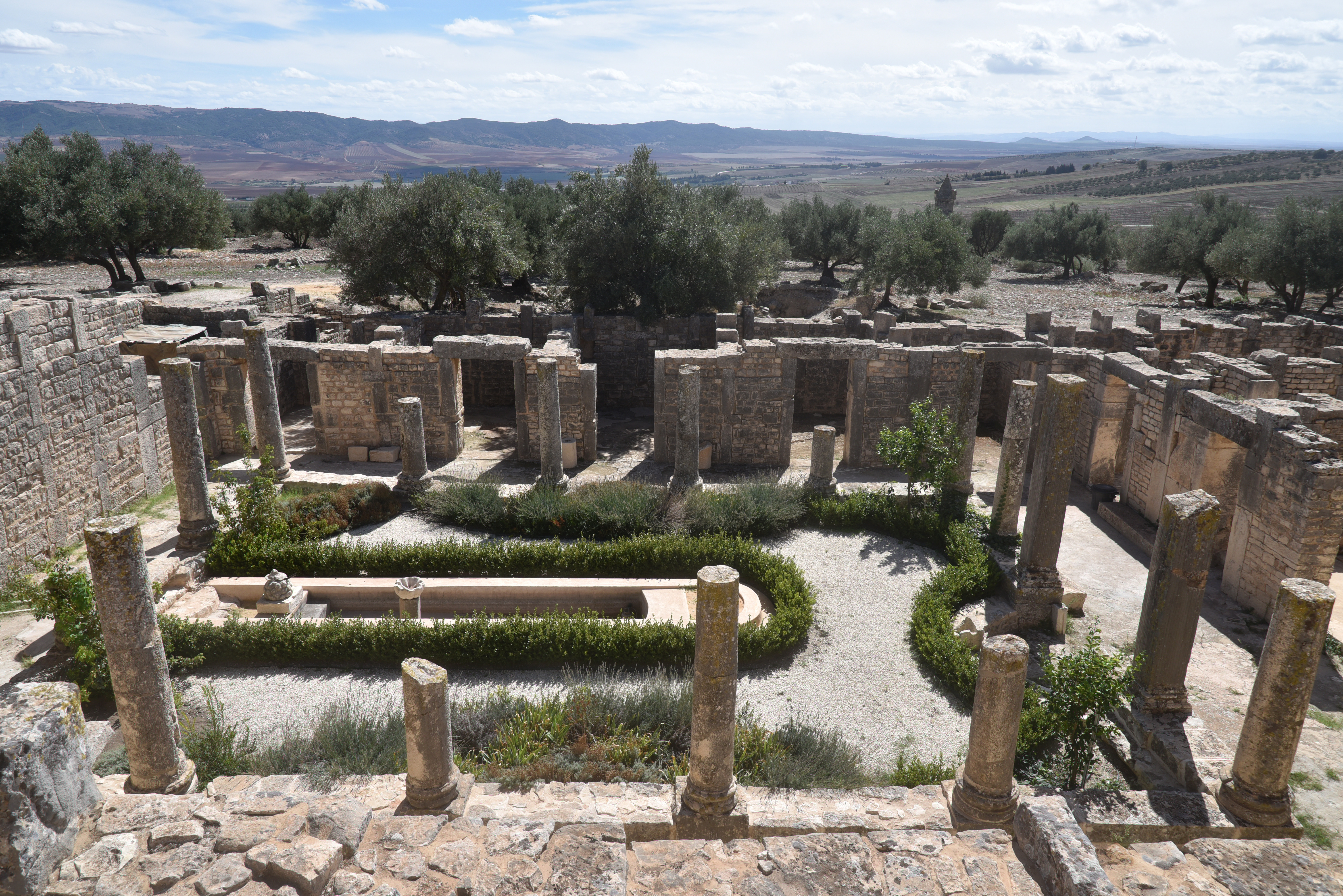 The road behind the Capitol leading west to the Arch of Alexander Severus.The Arch of Alexander Severus, built in AD 232, is a 4m-wide arch that once spanned a road that would have led to the city from the west.The Ain El Hammam Cisterns, which received water from an aqueduct. They had a total capacity of 6,000 m³ and were formed by five tanks measuring 34 x 5 meters each.The Temple of Juno Caelestis is dedicated to the Roman goddess Juno (an evolution of the Punic Moon Goddess Tanit). It was constructed between AD 222 and 235 during Alexander Severus’s reign.The Temple was built on the outer edges of the city. Its temenos is shaped like a crescent, a traditional symbol of Juno and Tanit.Inscription from the external frieze of the Temple of Caelestis records that it was financed by several members of the Gabinii family. CIL 08, 01474 Translation: Dedicated to Caelestis Augustus, Quintus Gabinius Rufus Felix Beatianus, increased the generosity of his parents, he had (this sanctuary) built and made its dedication.Thugga’s residential quarter. The layout of the homes is clearly visible.The House of Dionysus and Ulysses was built during the second half of the 3rd century AD. This one-storey house had a stickling rich decoration largely inspired by the Dionysian myths and the episode of the Odyssey referring to Ulysses escaping the sirens’ song.Odysseus and the Sirens, Mosaic from Dougga, 2nd century AD. Bardo National Museum, Tunis.House of the Trifolium is the best-preserved and largest house discovered on the site. It dates from the 3rd century AD.The house of Tripholium was built on two levels, with the entrance at street level and the rooms on the floor below. The rooms on the ground floor were arranged around a large court.The ground floor of the House of Trifolium is composed of a courtyard with a garden, surrounded by a colonnaded portico.