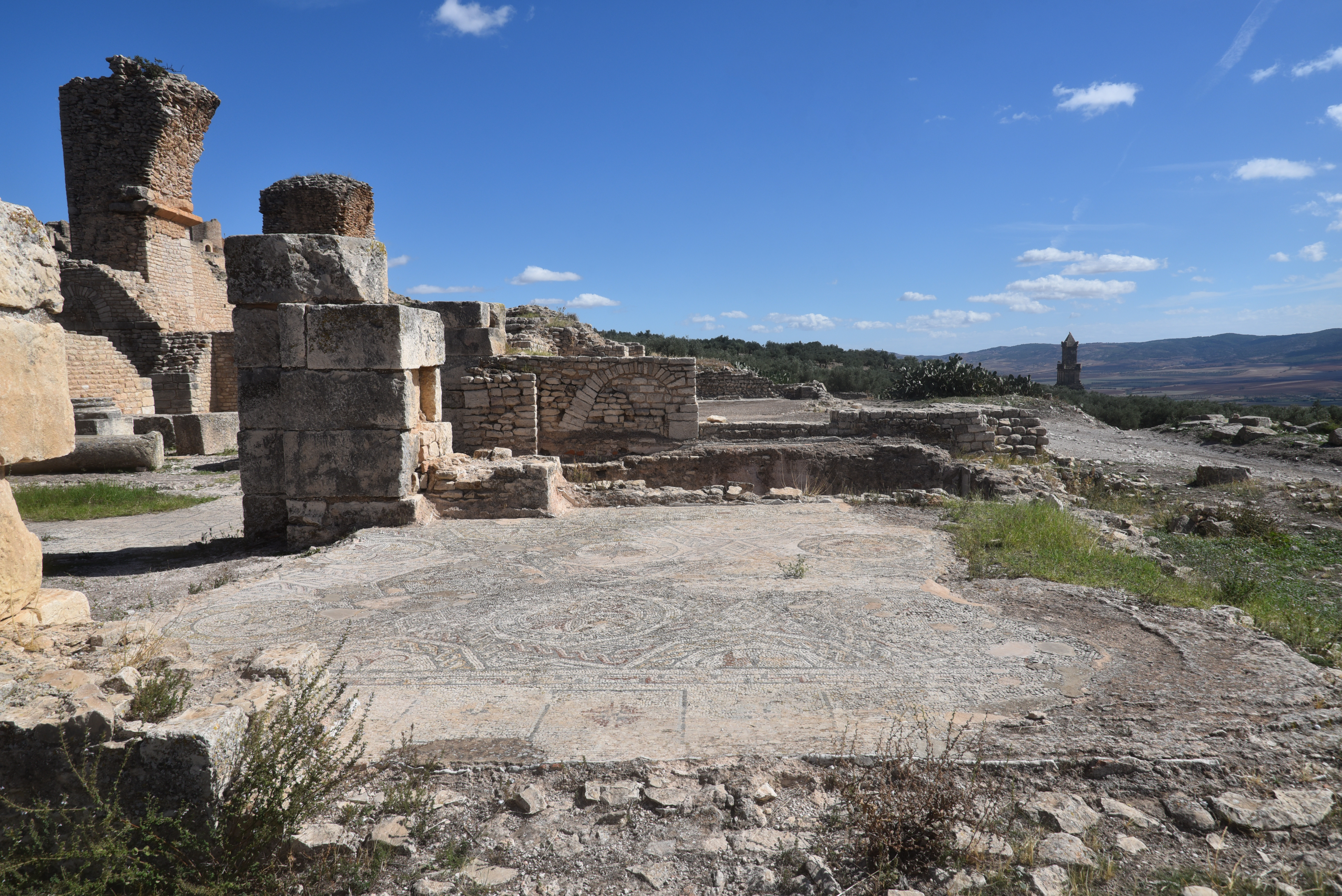The House of the Trussed Animals, the Baths of the Capitol and the Capitolium.The House of the Trussed Animals. The house was laid out around a peristyle (9 x 1.80m) that enclosed a garden bounded by eight columns. A large triclinium, an oecus and a cubicula opened toward the garden.The well-preserved Forum was built between AD 161 and 192. It was a vast square covering an area of about 1,400 m², surrounded by porticoes of cipollino green columns on three sides. The northwest side of this square is occupied by the Capitolium, in front of which a large masonry altar was erected.The Forum.The Capitolium was built on a massive podium in AD 168 and was dedicated to the Capitoline Triad of gods: Jupiter, Juno and Minerva.The Capitolium stood on a high podium with then fluted Corinthian columns of pink limestone. The building included carved Latin dedications to Marcus Aurelius, Commodus and the triad of Jupiter, Juno and Minerva. It was reached by a wide flight of stairs leading up from the Forum.The Capitolium’s vaulted basement rooms were converted into cisterns, while the basement of the cella was transformed into an oil mill. The pressing platform, counterweight, and settling basins of the oil mill still remain.The Temple of Peace, northeast of the forum. The temple had a marble-paved courtyard and a peristyle leading to a large marble hall. A statue of peace is thought to have once stood here.Stone relief of Pegasus in the Temple of Peace with the Capitolium in the background.View towards the Macellum (market), the Temple of Mercury and the Capitolium.The House of Bacchus and Ariadne. This large house, occupying most of an insula, dates to its current form from the early 5th century AD. The rooms were arranged around a peristyle garden. The mosaic depicting Bacchus and Ariadne in the large room that opens off the northwest portico gave the house its name. The southwestern part of the house was dedicated to business activities, including the production of olive oil.The Palestra of the Petronii, built in AD 225 at the expense of Petronius Felix and his sons.The Palaestra of the Petronii was a square courtyard surrounded by a Corinthian portico located between two baths. It was used for games and gymnastic activities (wrestling, boxing, pankration) before bathing.The Corinthian portico of the Palaestra of the Petronii with a relief depicting a Maenads, a female follower of Bacchus.Part of the dedicatory inscription that stood on the portico. It indicates that the construction of the palaestra was also financed by the decurions. ILAfr 00271The Summer Baths. They covered an area of approximately 2800 m² and were restored in AD 136.The Summer Baths had cold, warm, and hot rooms, fed from three large cisterns. The rooms were all lavishly decorated with marble, mosaics, and fountains.The Temple of Caelestis (Tanit). Very little remains of the Temple of Caelestis, originally the Carthaginian goddess Tanit (the wife of Baal Hammon), except the gate and a Punic column. The temple was turned into a church in the 6th century AD.The Temple of Baalat, a small square temple dedicated to the Punic goddess Baalat, chief goddess of the ancient city of Byblos (Gebal) in Phoenicia.The Temple Baalat, whose plan shows both Roman and Oriental influence, features a semicircular porticoed courtyard with an angular outline, preceded by a small prostyle temple that stands on a podium.The Temple of Ceres, turned into a church. The temple had a 900m2 courtyard decorated with mosaics and a portico with three gateways. Later, this portico became a church, and the cella became the baptistery.The Temple of Ceres, turned into a church. Numerous tombs were placed in the church, one of which revealed jewels.The Eastern Gate. Thuburbo Majus was not fortified, so it had no walls. The entrance to the town was marked by celebratory arches, one of which still stands on a hill to the east of the site.The ruins of the amphitheatre on the outskirts of the site.The south entrance of the amphitheatre.A massive cistern that supplied the town with water. It was once vaulted in concrete.The Western Gate.The Winter Baths, completed between AD 392 and 408. The bathhouse had more than 20 rooms organised around the frigidarium and covered an area of approximately 1600m².A hall in the Winter Baths with columns from Simitthus (Chemtou).Latrines in the Winter Baths, located to the southwest of the frigidarium.The House of Neptune (Maison de Neptune) is one of the best-preserved houses in Thuburbo Majus. It is a large residence in the early 3rd century AD. The house was laid out around a peristyle garden, with four porticos supported by twelve columns. A low wall separated the porticos from the garden.The peristyle garden of the House of Neptune (Maison de Neptune) has a semicircular basin on the east side, originally decorated with a scene showing Oceanus.Fountain basin from the House of Neptune with a scene showing Oceanus surrounded by sea monsters carrying Nereids. National Museum of Bardo.A room paved with polychrome geometric mosaic in the House of Neptune (Maison de Neptune).