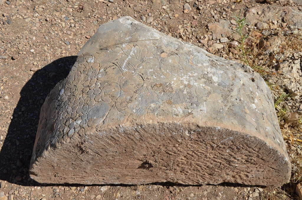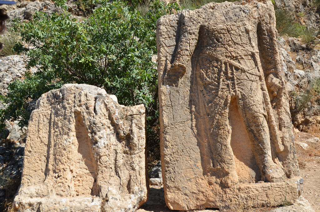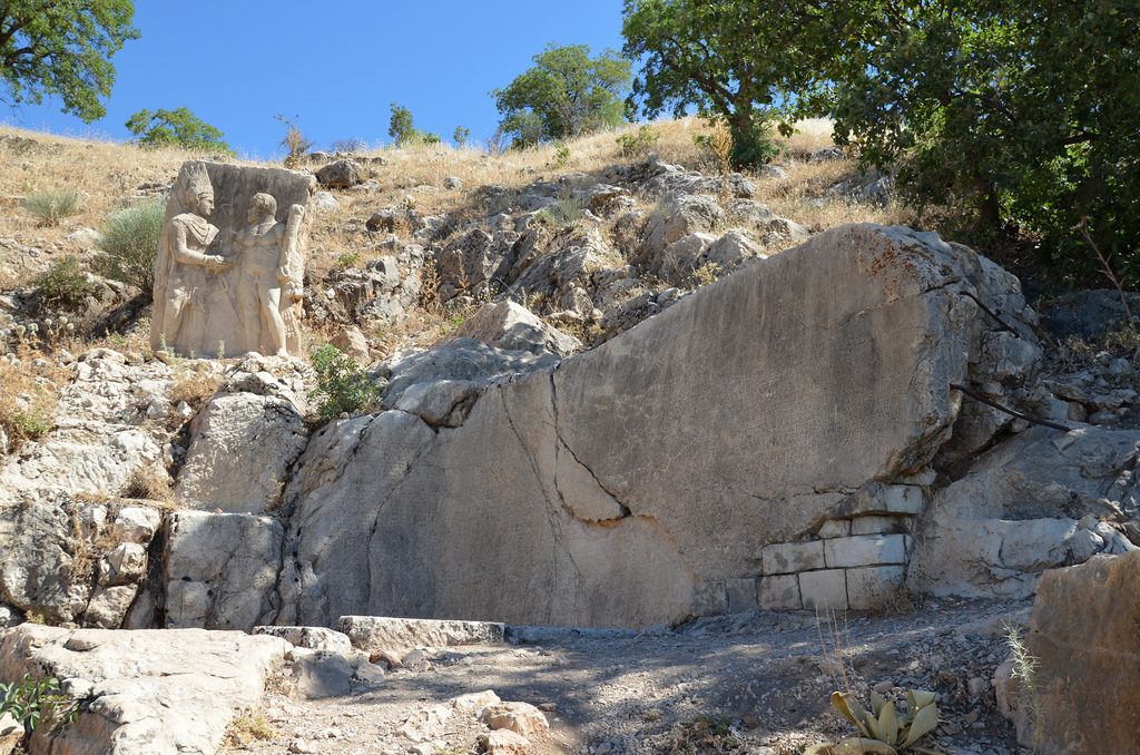 The West Terrace had the same features as those displayed on the East Terrace, but was considerably narrower than its eastern counterpart and lacked a main altar. It is now also more damaged, although the colossal heads are better preserved. The order of the enthroned statues, this time facing the setting sun, is identical to that of the east terrace. The orthostates depicting King Antiochus’ ancestors are also much better preserved. The West Terrace is completed by five reliefs depicting Antiochus shaking hands (dexiosis) with each member of his pantheon. It also included the famous ‘Lion Horoscope’, a relief depicting a lion with stars on its body (probably the constellation Leo) and a crescent moon on its chest. It has been argued that the scene might represent a kind of horoscope, one of the oldest known in the world. Recent research has shown that the lion slab may reflect the state of the skies at specific moments in 49 BC, when the monument’s construction might have begun. The dexiosis reliefs and the Lion Horoscope have been removed from the site and are stored in the Adıyaman Archaeological Museum.